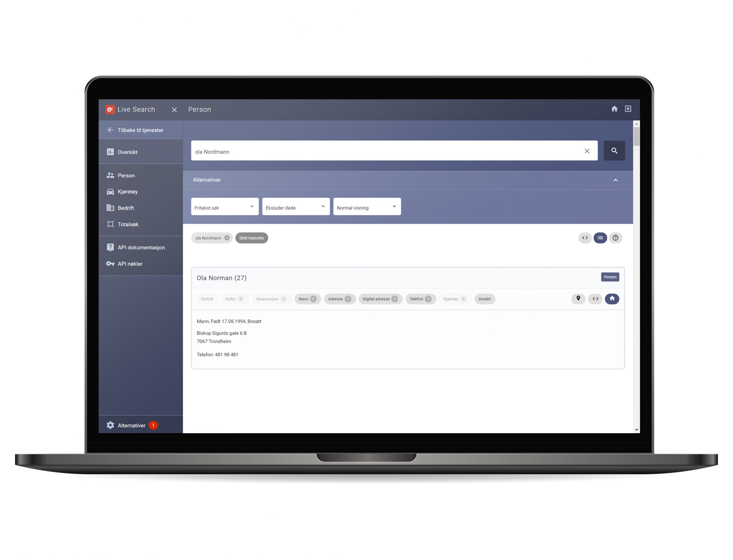 - Live Search kan brukes til enkle oppslag via vårt UX eller det kan integreres direkte inn i et saksbehandlingssystem.